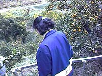 仕事人、糟屋さんです。背景は小坂の山々。 杉山社長と糟屋さんは古くからのお友達です。お二人の会話を聞いていると、「このミカンはまずいなぁー(パクパク)」「お、こりゃうまい(パクパク)」「高く買えよ」「それは好きなだけ持っていけ」・・・と、愉快愉快。社長も気兼ねなく意見を言えて、でも糟屋さんの仕事に対する尊敬の念は忘れないから、生産者にとっても、お客様にとっても、利益のある商品が提供できるのでしょうね。 |