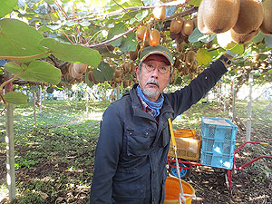 | 静岡市のキウイフルーツ生産者の一人、立川さん。 立川さんは、キウイだけではなく、レモンの栽培も しています。草生栽培にこだわっています。 |