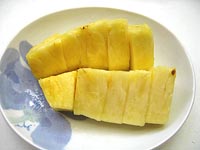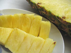 るクエン酸にも胃液の分泌を良くする働きがあり、プロメリンと合わせて消化を促し、胃腸を健康に保ってくれます。 ただ、プロメリンは強力な消化酵素なので、舌が荒れていたりすると、そこに酵素が作用し、その部分の蛋白質を溶かすので、口のなかがぴりぴりと痛くなる場合があります。食べ過ぎには要注意です。 |
