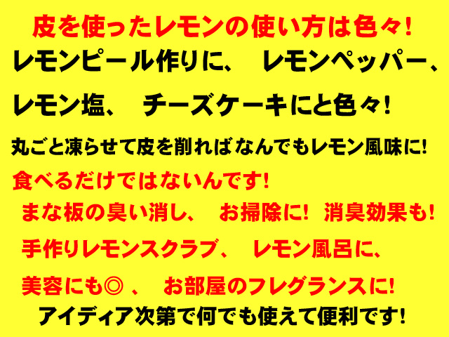 | ※ | 皮についている白いものはレモンの病気を防ぐための石灰です。農薬ではありません。気になる方は表面を水洗いしてください。 |