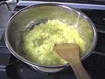 - 香りが出てきたら玉ねぎを入れ、薄茶色になるまでじっくりと炒める。
